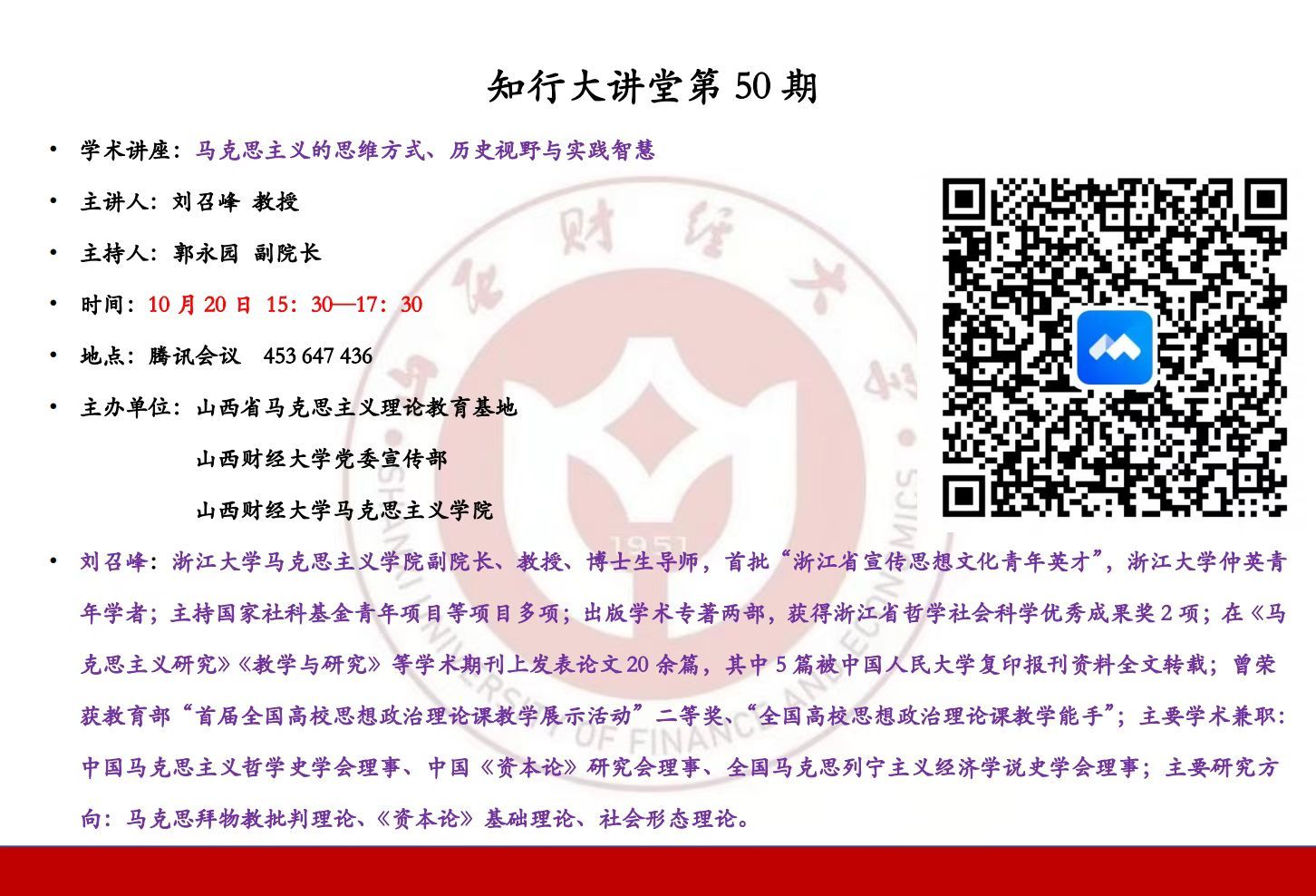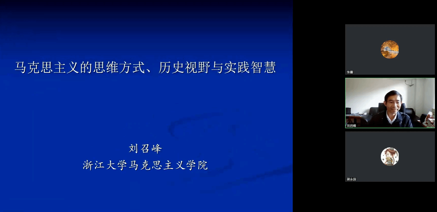 10月20日下午,由山西省马克思主义理论教育基地主办,党委宣传部、太阳成集团tyc122ccvip承办的知行大讲堂第50期以网络研讨会的形式顺利举行。浙江大学太阳成集团tyc122ccvip副经理、教授、博士生导师刘召峰教授作了题为《马克思主义的思维方式、历史视野与实践智慧》的精彩报告。太阳成集团tyc122ccvip师生、思政工作骨干以及国内兄弟院校师生450余人通过腾讯网络研讨会参加此次学术讲座。讲座由太阳成集团tyc122ccvip副经理郭永园主持。