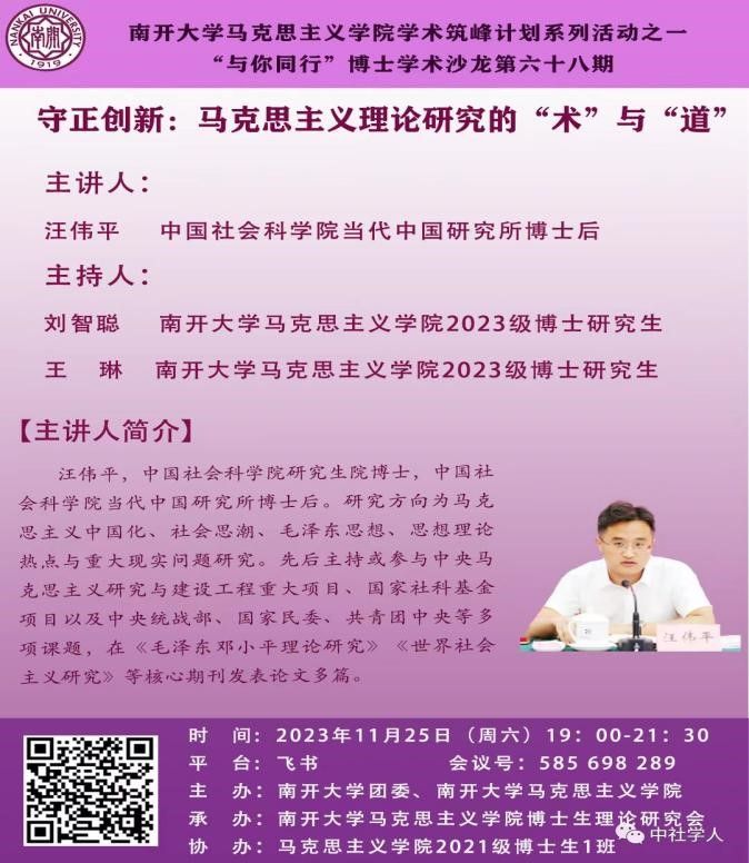 11月25日晚,南开大学太阳成集团tyc122ccvip学术筑峰计划系列活动之一“与你同行”博士学术沙龙以腾讯会议的形式如期举办。中国社会科公司研究生院博士,中国社会科公司当代中国研究所博士后,汪伟平老师作了题为《守正创新:马克思主义理论研究的“术”与“道”》的学术讲座。公司2023级马克思主义理论专业研究生全体在公司会议室集中收看学习。