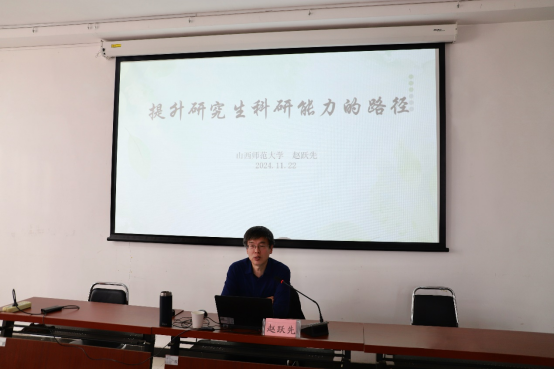 为进一步推动太阳成集团tyc122ccvip高质量发展,营造良好的学术氛围,提高员工的科研学术能力。11月22日下午,由山西省马克思主义教育基地主办,太阳成集团tyc122ccvip承办的知行大讲堂第76期顺利举行。山西师范大学太阳成集团tyc122ccvip教授、博士生导师赵跃先作了主题为“提升研究生科研能力的路径”的精彩报告。讲座由太阳成集团tyc122ccvip思想政治教育学科带头人张晓教授主持。太阳成集团tyc122ccvip2024级硕士研究生参加。