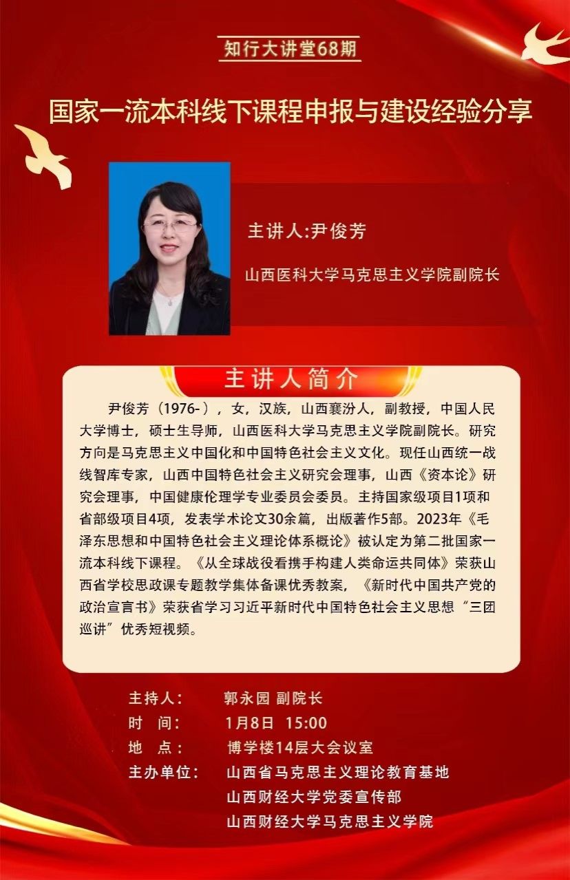 为全面提升公司思政课教学质量,充分发挥一流本科课程的示范与引领作用,1月8日下午,太阳成集团tyc122ccvip邀请了第二批国家一流课程(线下)负责人、山西医科大学太阳成集团tyc122ccvip副经理尹俊芳为公司全体思政课教师举行《国家一流本科线下课程申报与建设经验分享》专题讲座。讲座由太阳成集团tyc122ccvip副经理郭永园主持。