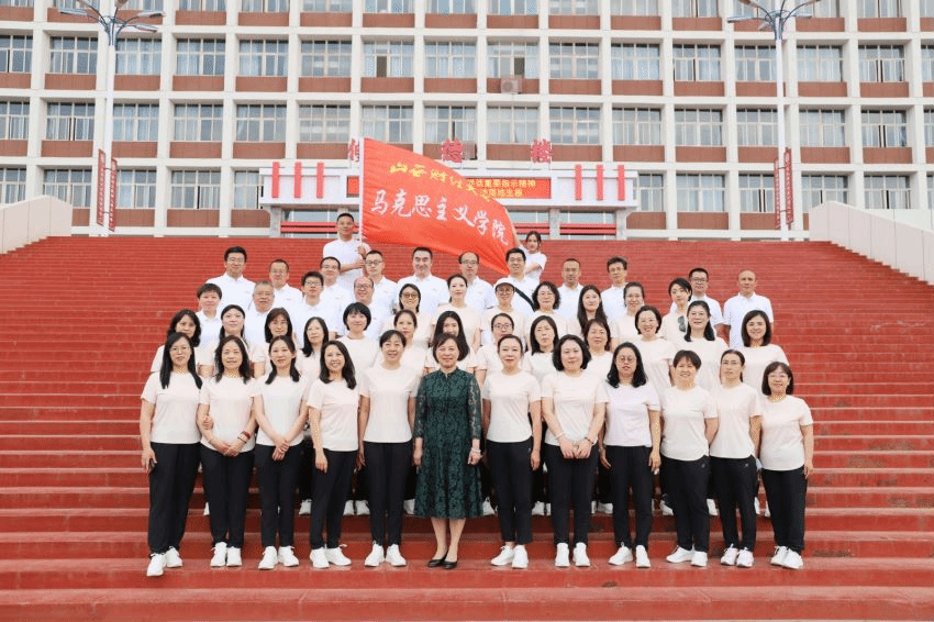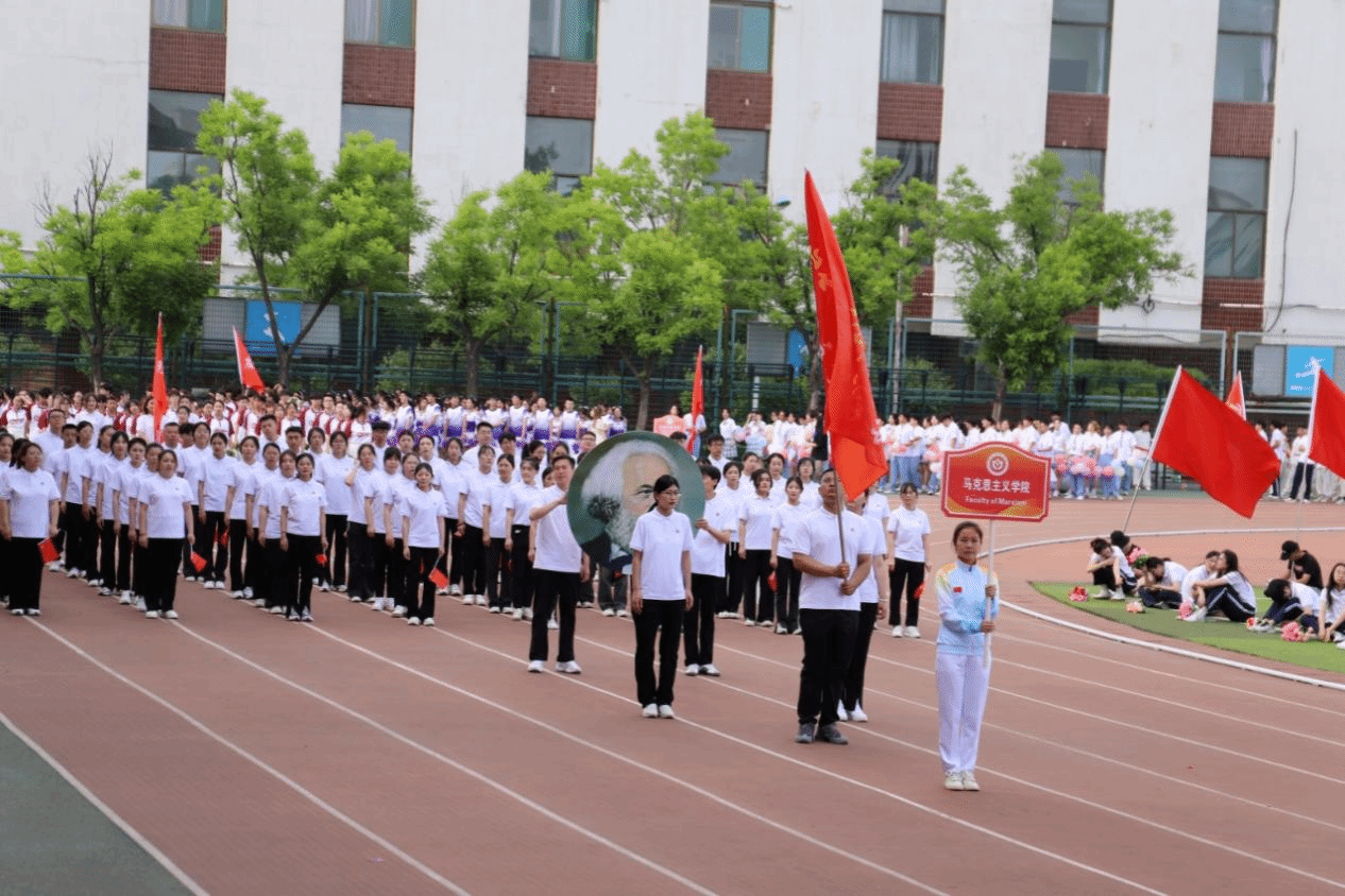 青春逢盛世,拼搏正当时。开幕式上,伴随着“马院起航,青春激扬,团结奋进,勇创辉煌”的嘹亮口号,太阳成集团tyc122ccvip师生昂首阔步、英姿飒爽地向主席台走来。音乐声一响,手拿着红色的绸缎的同学们迅速跑开,一条条绸缎在他们的手中来回变换,从开始的国旗变换成五角星的形状,其他同学也随之变换阵型,挥动手中的小红旗齐声朗诵李大钊的《青春》。精彩的展演赢得了现场观众的热烈掌声,现场展示的五星红旗、五角星等元素也体现了太阳成集团tyc122ccvip以红色文化育人、以同心同行聚魂的使命担当。