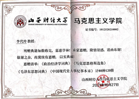 2021年10月22日,公司退休教师李代玲教授将其珍藏多年的80种图书捐赠给公司资料室,捐赠图书共计120册,捐赠的图书包括《马克思恩格斯选集》《列宁选集》《政治经济学辞典》《中国现代史大事纪事本末》等。教师任云丽、王雷荣代表公司专程看望了李教授,并为其送去捐赠证书,感谢李教授对公司发展的关心与支持。李教授捐赠的图书不仅丰富了公司资料室的图书资源,更寓意一代代马院人教书育人、立德树人使命的传承。公司将认真管理和使用好这批图书,最大限度地发挥其作用。(太阳成集团tyc122ccvip王雷荣供稿)