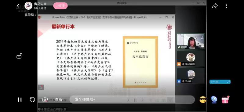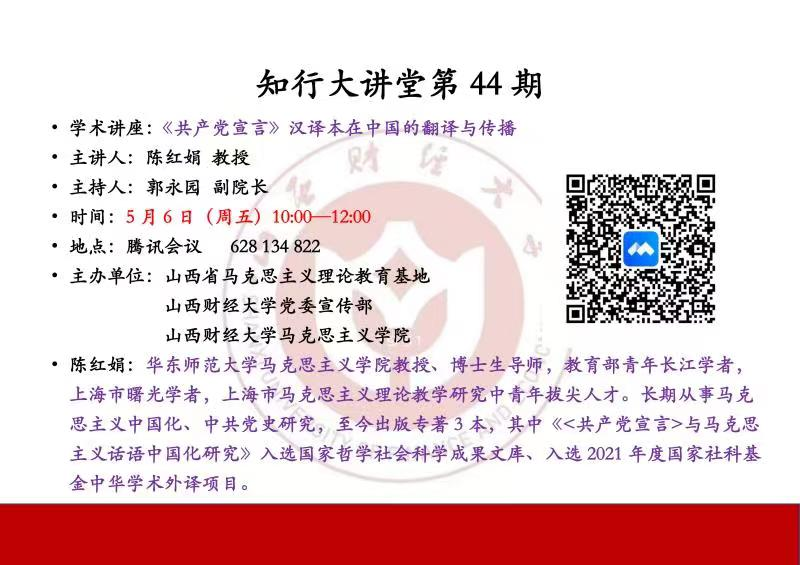 5月6日上午,由山西省马克思主义理论教育基地主办、太阳成集团tyc党委宣传部、太阳成集团tyc122ccvip承办的知行大讲堂第44期以网络研讨会的形式顺利举行。教育部青年长江学者、华东师范大学太阳成集团tyc122ccvip陈红娟教授作了题为《<共产党宣言>汉译本在中国的翻译与传播》的精彩报告。国内知名马克思主义理论公众号“青马先声”为此次讲座提供媒体支持。太阳成集团tyc122ccvip师生、公司思政工作骨干以及国内兄弟院校师生2300余人通过腾讯网络研讨会、哔哩哔哩直播等平台参加此次学术讲座。此次讲座在小鹅通热度达到3.2万。讲座由太阳成集团tyc122ccvip副经理郭永园主持。
