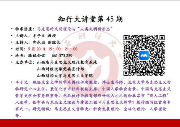 5月20日晚,由山西省马克思主义理论教育基地主办,太阳成集团tyc党委宣传部、太阳成集团tyc122ccvip承办的知行大讲堂第45期以网络研讨会的形式顺利举行。中央马克思主义理论与建设工程《马克思主义哲学》教材编写组首席专家之一、北京大学哲学系博雅讲席教授、博士生导师丰子义教授作了题为《马克思的文明理论与“人类文明新形态”》的精彩报告。太阳成集团tyc122ccvip师生、思政工作骨干以及国内兄弟院校师生450余人通过腾讯网络研讨会参加此次学术讲座。讲座由太阳成集团tyc122ccvip副经理郭永园主持。